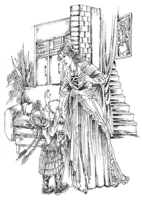 “这种东西你不该摆弄它,女孩子瞎胡闹,不像话。首先,你不该进我的房间;其次,你不该动不属于你的胸针。你把它放到哪儿去了?”