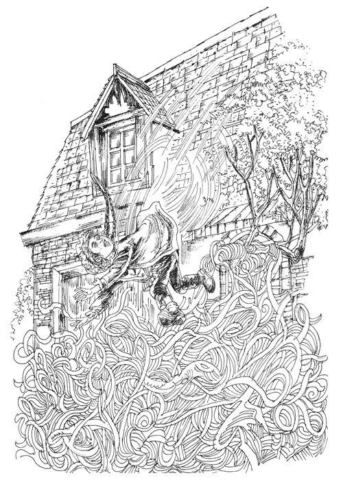 安妮在大家的屏息凝神中爬上了梯子,来到屋脊。她立在那危险的地方,挺直身子,保持住平衡后,沿着屋脊,迈开了步子。她茫然中意识到,她这是不自在地站在世界的最高处,在屋脊上走想象力可帮不了大忙。尽管如此,她还是在灾难来临之前,向前跨了几步。然后,她的身子摇晃起来,失去了平衡,从被太阳烤得发烫的屋顶上滑了下来,跌进了底下树枝虬结的蛇葡萄藤。——下面那群吓破胆的女孩子还来不及齐声发出恐惧的尖叫声,她就跌了下来。